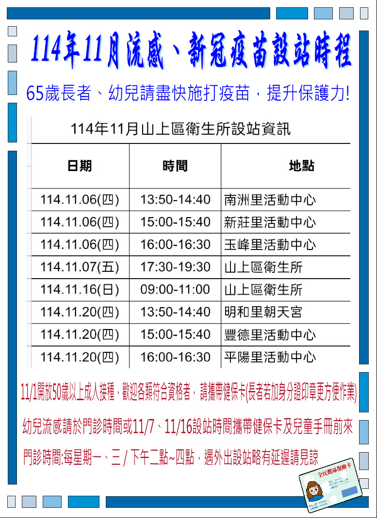 11月1日開始開放50歲以上成人接種,請65歲以上長者及六個月以上幼兒尚未接種者,盡快施打。 秋冬流感蠢蠢欲動,打疫苗提升自身的保護力,降低重症與住院風險。流感疫苗與新冠疫苗(左流右新)一起打! 114年11月第二次社區設站接種時段如下圖, 另衛生所加開~夜間設站:11/07星期五 ...更多