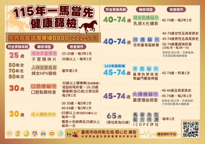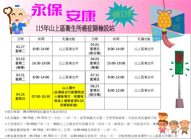 山上衛生所115年癌症設站場次如附檔,115/01/27星期二8:00~14:00辦理第一場癌症篩檢~乳房攝影、子宮頸抹片檢查、大腸糞便潛血檢查、胃幽門螺旋桿菌檢測、還有B、C型肝炎檢查,歡迎符合資格民眾前來參加!
