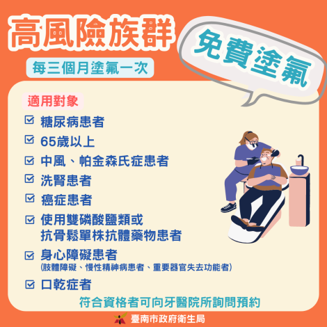 高風險族群免費塗氟,每三個月可塗氟一次,高風險族群對象有: